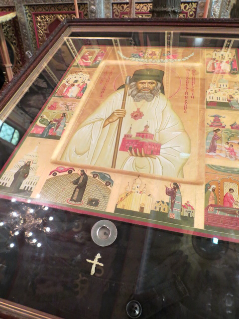 Так появился единственный в Америке приход, основанный святителем Иоанном Шанхайским. Внутри храма, с левой стороны у солеи, – образ святителя, где среди клейм – изображение американского Капитолия, в котором владыка просил за свою паству, и другие чудесные моменты жития святого. В 1983 году настоятель протоиерей Виктор Потапов, с группой прихожан совершая паломничество на Святую Землю, находился в монастыре преподобного Георгия Хозевита в Иудейской пустыне. Там пребывает большая часть главы святого Иоанна Крестителя. Узнав, откуда прибыли паломники, игумен благословил передать приходу частицу мощей его небесного покровителя – одну из 850 соборных святынь.