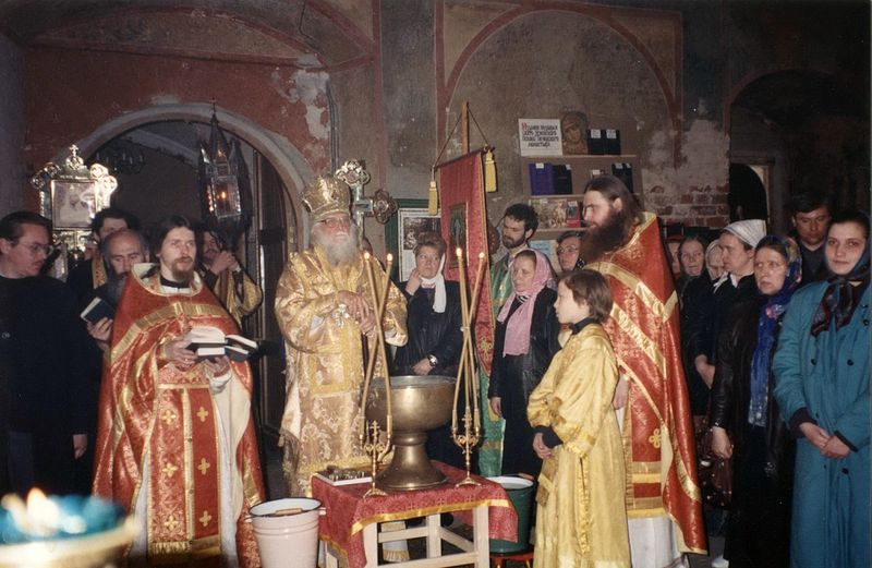 Епископ Василий (Родзянко; † 1999), иеромонах Тихон (Шевкунов) и иеромонах Никита в храме московского Сретенского монастыря во время водосвятного молебна на Преполовение Пятидесятницы. 1994 г. Епископ Василий (Родзянко; † 1999), иеромонах Тихон (Шевкунов) и иеромонах Никита в храме московского Сретенского монастыря во время водосвятного молебна на Преполовение Пятидесятницы. 1994 г.