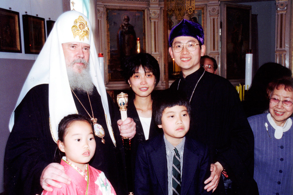Святейший Патриарх Алексий в Соборе в Киото в 2000 году вместе со священником Ионном Оно, матушкой Саррой Оно и их детьми — Алексием (в постриге Николаем) и Любовью Святейший Патриарх Алексий в Соборе в Киото в 2000 году вместе со священником Ионном Оно, матушкой Саррой Оно и их детьми — Алексием (в постриге Николаем) и Любовью