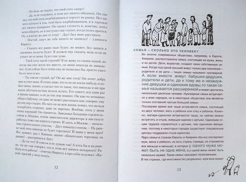 У кавказского мальчика полная крепкая семья. У Кирилла — по-другому. Если цель книги, как заявлено в прологе, — рассказать о семьях народов земли, то, по версии автора, получается, что типичные русские семьи — это матери-одиночки. У Кирилла мама — дважды одиночка, в данный момент она ждет ребенка от приходящего бойфренда.