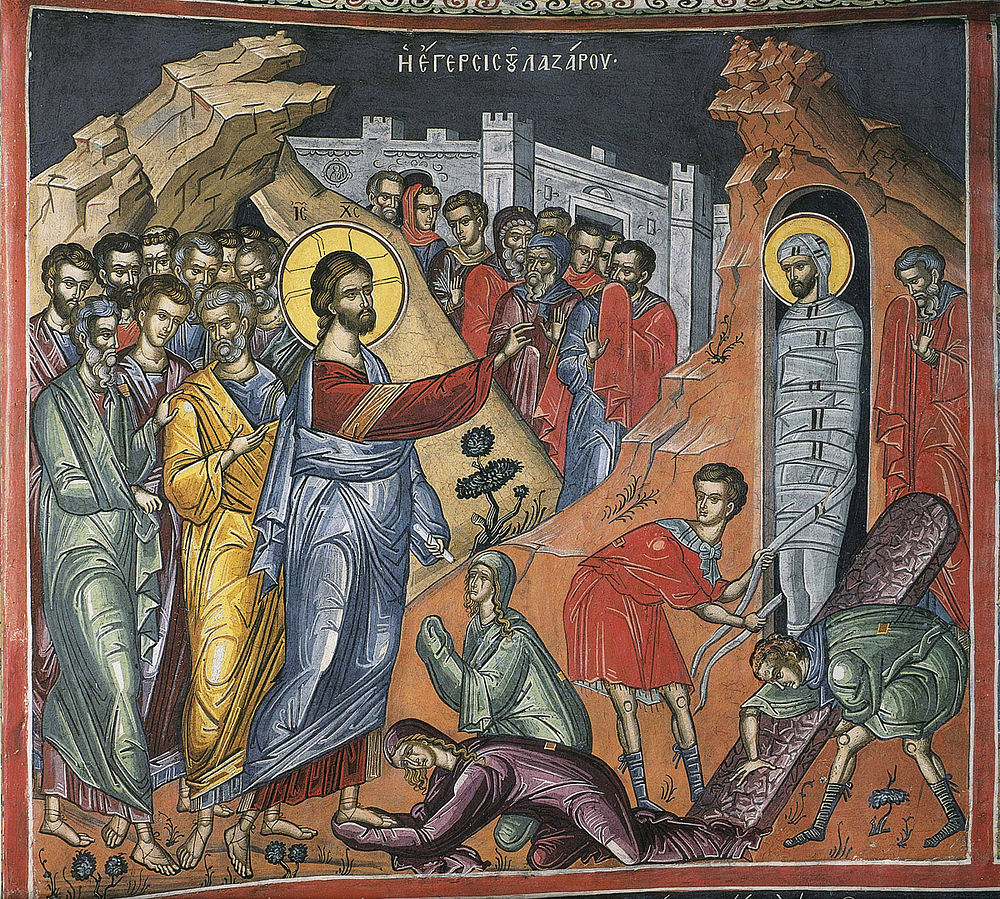 Возвращение Лазаря к жизни и его выход из гроба олицетворяют собой пробуждение к жизни того, кто кается со слезами. Высвобождение воскресшего из погребальных пелен означает освобождение души от греховных привычек, чтобы они больше не связывали ему ни рук, ни ног, ни чувств и он, свободный, мог бы идти вслед за Христом всю свою жизнь.