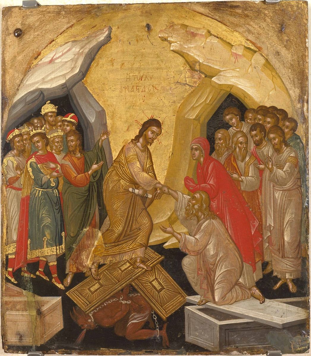 Воскресение Христова. Икона. Христос держит за руку Адама, за спиной которого Ева и ветхозаветные праведники. За спиной Христа - святые пророки
