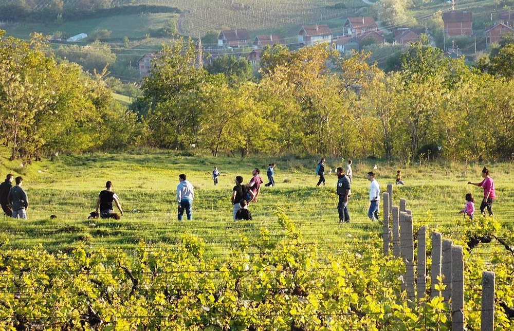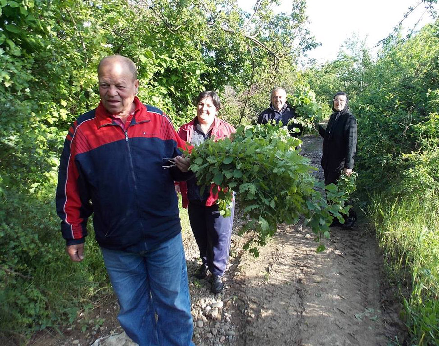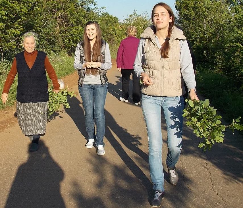 - Нек иде високо и растера црне облаке, да нам више не пада киша! - повика један дечак, док се остали дечаци растрчаше по ливади некако ушушканој, између два винограда. Граја се ширила около, а кад дођоше и они мало старији, лопта је јуришала с краја на крај ливаде. Сви се зарадоваше јер је Ђурђевдан дан за радовање, али и због чињенице да на ливаду могу једино кад је пуно људи у пољу, сами не смеју. Мало даље, низ пут, размилели се стари и млади, једни се враћају са гранчицама трепетлике, бреста и храста у рукама, а други тек иду да нађу ,,зелениш“. У једној групи деда Ђорђе са нешто млађим од себе Ораховчанима Новицом, Димитријем и Младеном. Са осталим гранчицама убрали и гранчице дрена,, да буду здрави као дрен“. У рукама Добринке Шарић угледах пар листова и цвет дивље јагоде. Рече да је и то за здравље да се буде црвен ко јагода. Две девојке са истим именом, Милица и Милица, уплеле у косу венчиће, и смеју се док их жена из комшилука нежно удара гранчицом трепетлике по леђима ,, да момци трепере за њима“. На трактору окићеном зеленишом петогодишњи Јован је засео између оца и рођака и ужива у ђурђевданској вожњи. Мирис исцветалог багрема се мешао са мирисима траве, и жита, на неким местима полеглог, од обилних киша. Украј једног винограда засело пар жена, служе се колачима и куцају васкршњим јајима.