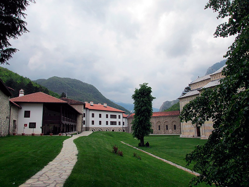 Через полтора часа, «насладившись» видами «независимого Косово», устав от мелькания албанских и американских флагов, весьма и весьма недружелюбных взглядов, а то и жестов прохожих – шиптаров, теперешних жителей древнего сербского города Печ («Пейя», как это звучит по-албански), мы подъехали к монастырю. Природа не просто великолепная – она потрясает: речка Быстрица, горный массив Проклетие, небо, ослепляющее своей синевой, леса. Чуть поодаль видны монастырские ворота, за ними – великолепный собор Вознесения Господня.