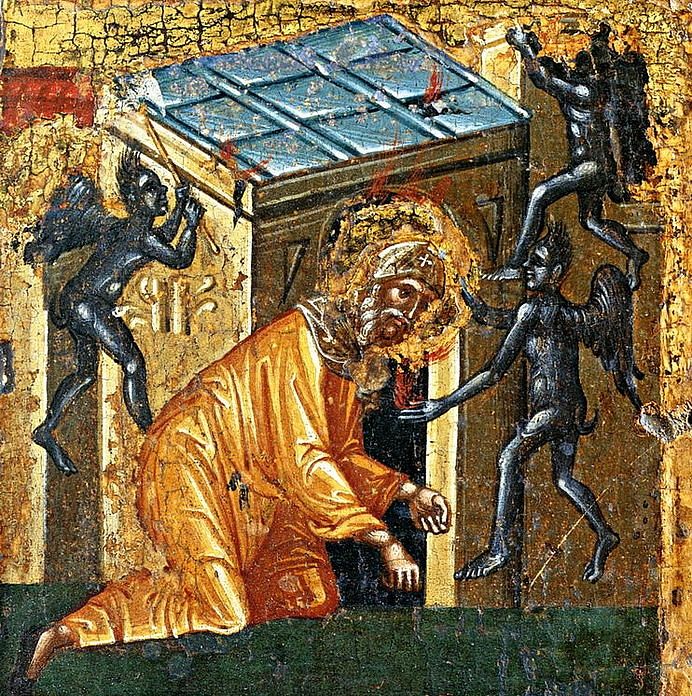 Преподобный Зосима Соловецкий изгоняет молитвами искушающих его бесов