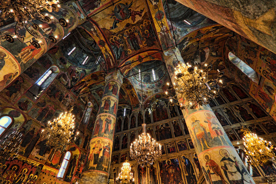 При посещении Архангельского собора сразу обращает на себя внимание холодность и неуютность интерьера, какая-то мертвость, как будто у собора отняли душу. Приходится объяснять это тем, что собор используется не по назначению. Он, прежде всего, музей, молитвы и церковные песнопения в нем нечастое явление. Но где как не в нем должны совершаться ежедневно заупокойные богослужения! Ведь этот собор – усыпальница десятков самых известных представителей истории России, творцов ее, великих князей и царей. Лежат и ждут наших молитв в этом храме собиратели русских земель, основатели Русского государства, унижаемые и оскорбляемые ежедневно толпами туристов.
