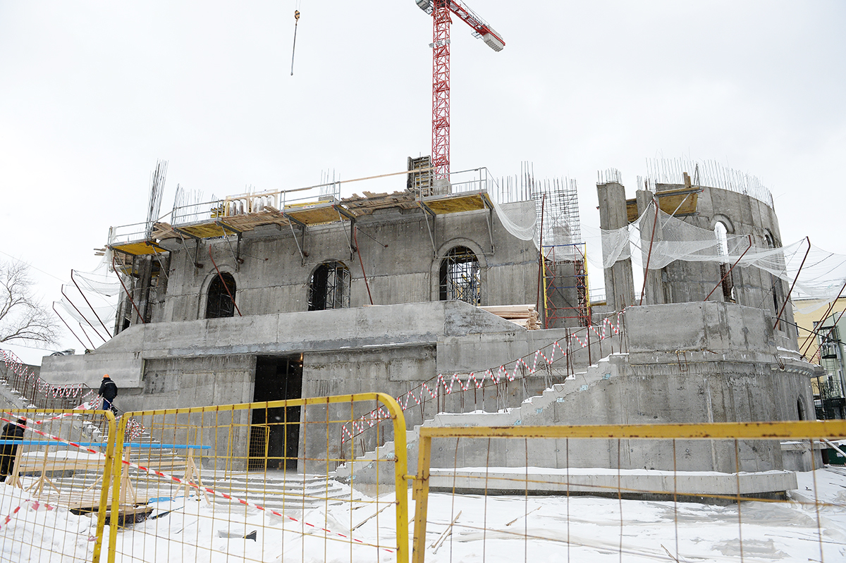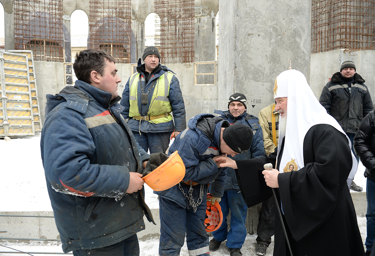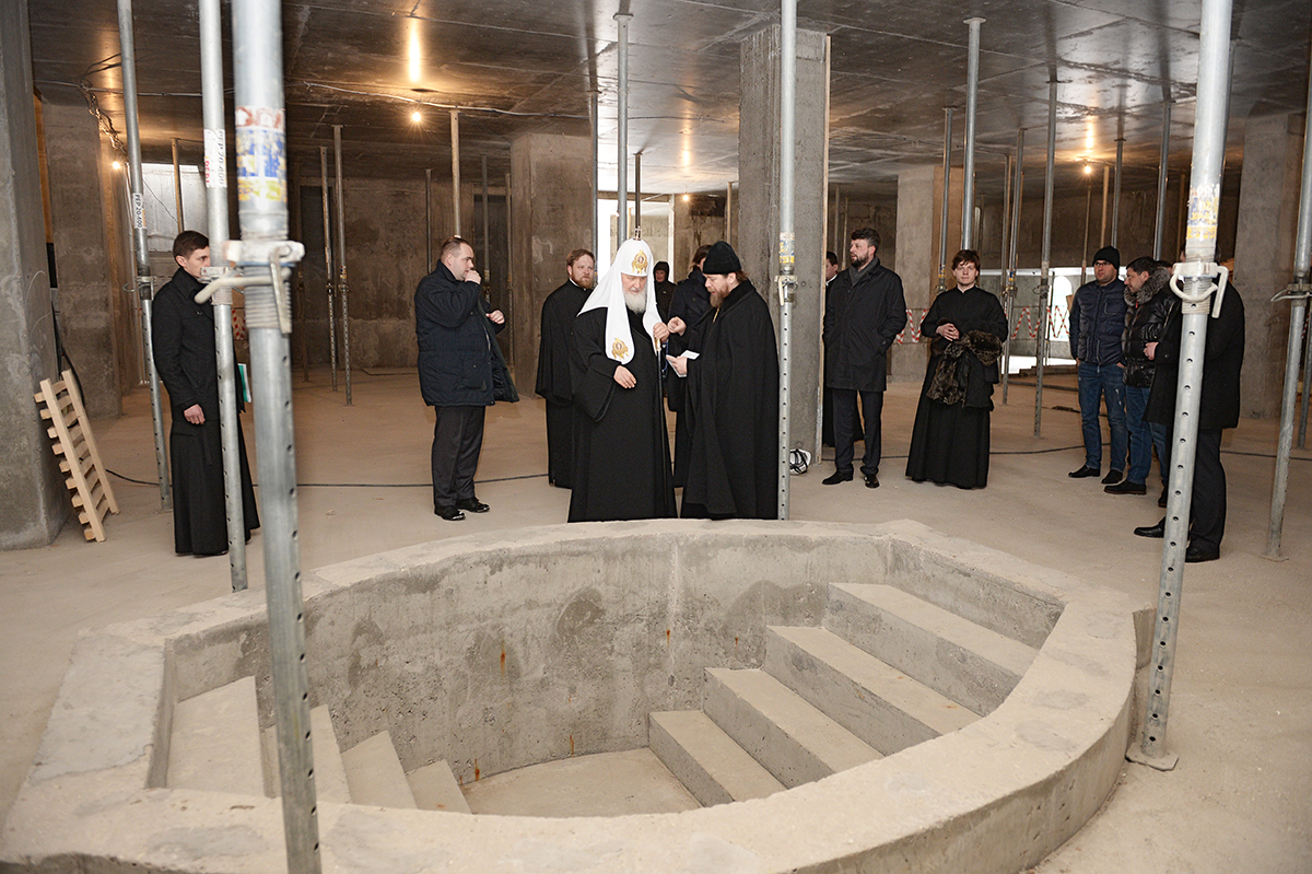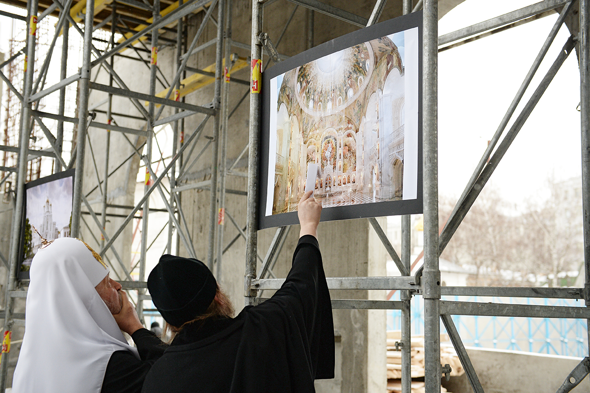 Затем Святейший Патриарх Кирилл в сопровождении архимандрита Тихона (Шевкунова) ознакомился с ходом строительства храма Новомучеников и исповедников Российских в Сретенском монастыре.