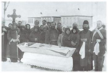 Борис принес с собой на нашу встречу толстую папку, в которой хранит материалы о своих земляках, жителях Невежкино. Планирует со временем написать о них книгу. Вот на старинной черно-белой фотографии — группа людей, стоящих у гроба. В ряду крестьян привлекает внимание батюшка в скромном, если не сказать ветхом, облачении. С этой фотографии, по словам Бориса, и началась его история…