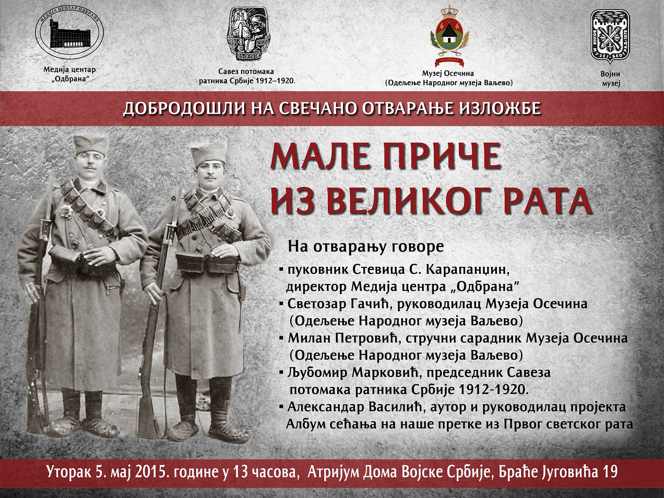 У склопу обележавања стогодишњице од Првог светског рата, у Малој галерији Дома Војске Србије 5. маја 2015. године, са почетком у 13 часова, биће отворена изложба „Мале приче из Великог рата“, коју као организатори потписују:
