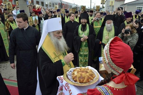 У нас было запланировано пять остановок в Архангельской области — для служения молебнов и общения с местным населением. Мы приезжали, нас встречало местное духовенство и районное руководство. Встречали с караваями, песнями, очень торжественно. Из поезда выходило духовенство, облачённое для служения молебна. Миряне шли с самодельными хоругвями, их было по тридцать на каждый из тринадцати вагонов. Мы становились в виде каре, в центре архиереи, вокруг — остальные приехавшие. Обычно сначала были какие-то приветственные слова, а после начинался общий молебен. В итоге получалось грандиозное торжество. Для тех глухих мест, где одни леса, в которых прячутся маленькие посёлки, увидеть пятерых архиереев и человек двести духовенства — думаю, это что-то невероятное. Было множество паломников, это придавало событию дополнительную масштабность.