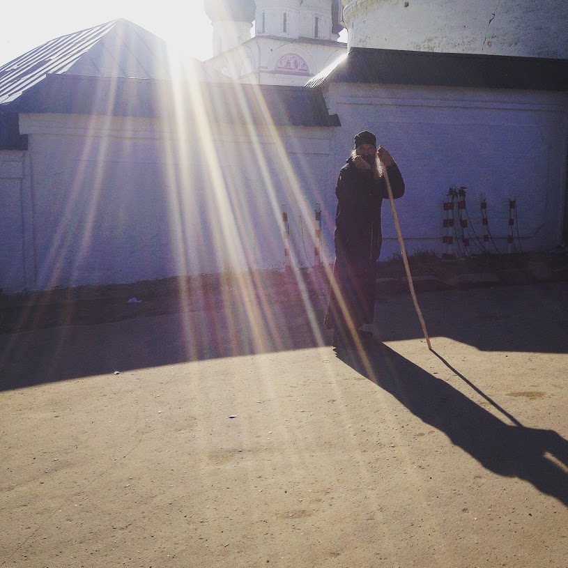 Встречает нас былинного вида монах. Опирается на посох, смотрит серьезно. Ничего не говорит. Но ощущения, конечно… Похлеще фейсконтроля.