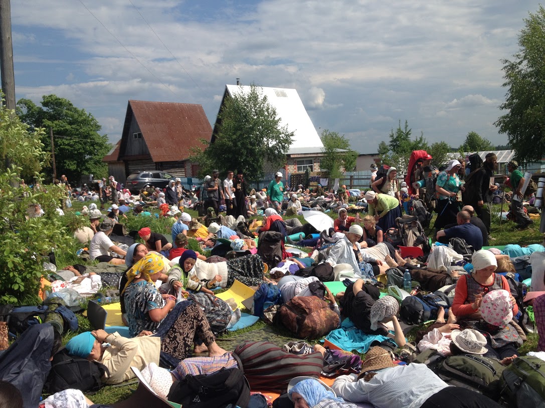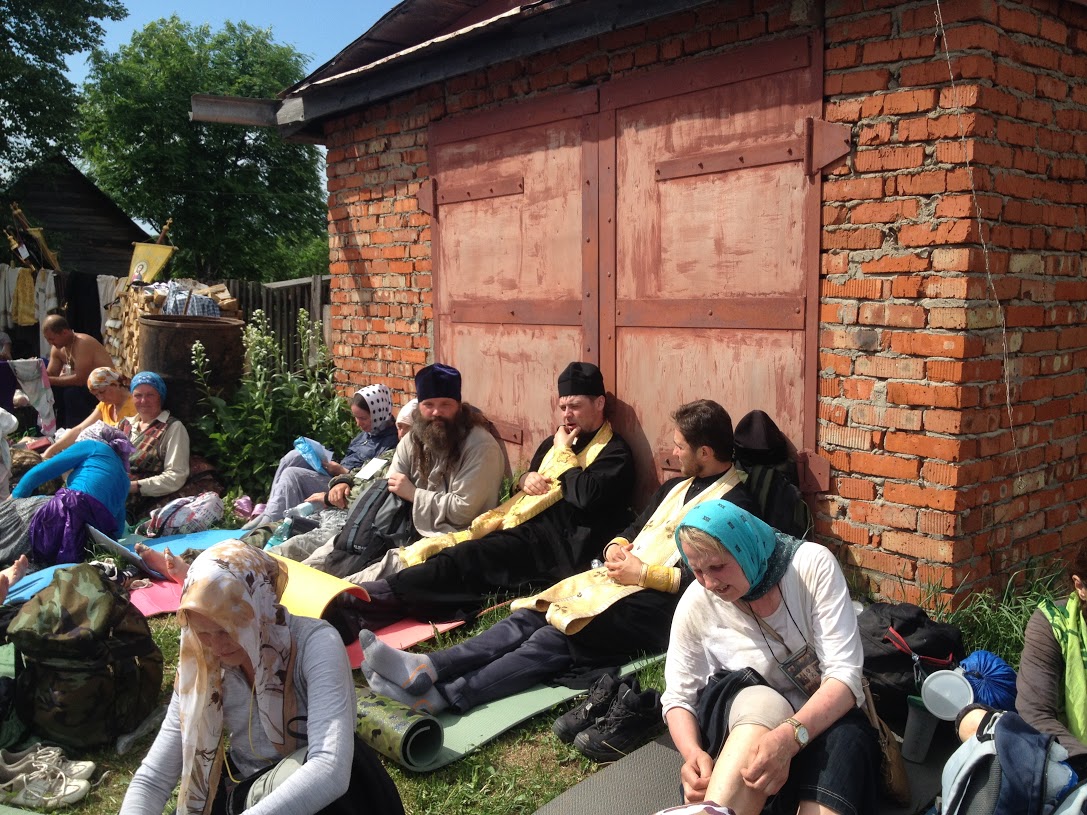 Иду к монастырю. Народ собирается. В старину бы сказали: «стекается люд». Люд самый разный: молодые и взрослые, богатые и бедные, мужчины и женщины, дети. Увидела в толпе большого ижевского начальника; кроме того, директора ижевского йога-центра; кроме того, иностранцев – немцев, сербов, украинцев. Вот женщина приехала из Одессы. Ей трудно стоять – возраст. Сидит на скамеечке. «Как же вы пойдете?» – говорю. «С Божией помощью. Сколько смогу».
