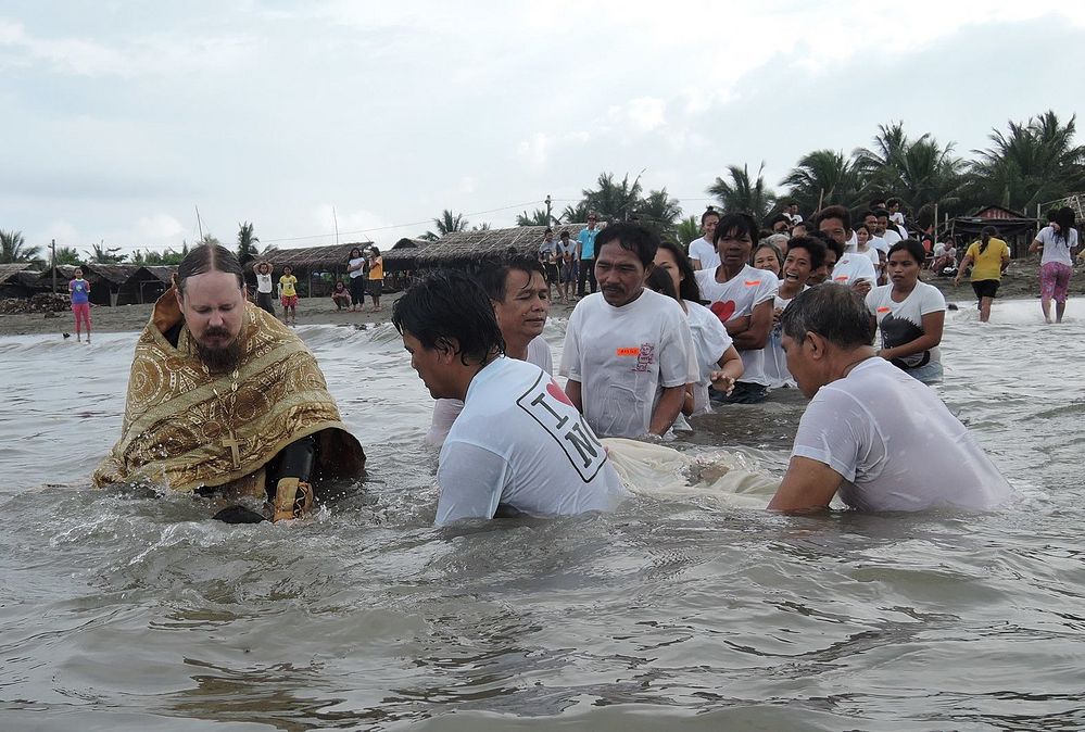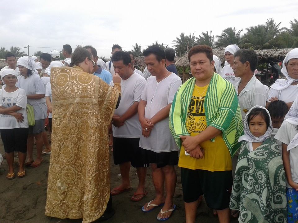 Затем началось таинство. Люди построились в две большие шеренги, отец Георгий зачитывал на себуано вопросы, а филиппинцы хором отвечали. Потом все 240 человек пели Символ веры. После священники стали помазывать всех елеем. Отец Кирилл читал молитвы по-английски, отец Георгий – по-церковнославянски. Настало время крещения. Первая шеренга выстроилась в колонну справа, а вторая – слева. К этому времени в океане поднялись довольно большие волны. Заходить было нелегко, прибой почти сбивал с ног. Первым крещение принял аглипайский епископ Эстебан Вальмера, в святом крещении Стефан. Следом за ним были крещены пять клириков Аглипайской церкви: епископ Рохелио Рингор, получивший имя Григорий, священник Джон Кольядо, выбравший новое имя в честь святого апостола Тимофея, священник Диоскоро Бергадо, родившийся в день памяти святителя Алексия Московского и взявший себе имя этого русского святого, священник Елизер Дэлфин, ныне Елеазар, и диакон Ренато Буниел, получивший имя в честь святого Романа Сладкопевца. Их крестили отец Кирилл и отец Георгий вместе. Потом они разделились и, разойдясь метров на пятьдесят, стали крестить людей в две очереди. Более часа провели мы в океане, ставшем на это время гигантской купелью.
