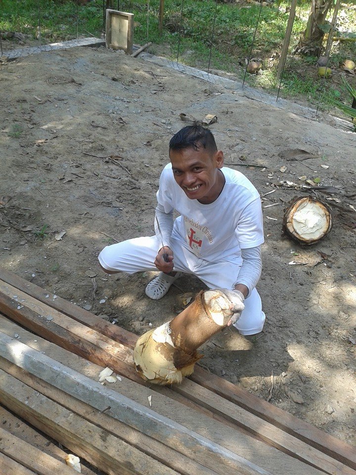 Филиппинцы что только не едят. Если с животной пищей всё более-менее понятно: мясо, курица, рыба, то с растительной пищей интереснее. В ход идут самые неожиданные вещи. В прошлый раз я рассказывал о супе из ствола банана, а сегодня пришла очередь кокоса. Думаю, все пробовали орех. А вот то, что можно есть саму пальму, я не знал. Оказывается, если сердцевину кокосовой пальмы долго варить со специями, то можно ее есть. Даже вкусно. Этим занимался Ренебой – наш добровольный помощник. На его футболке написано: «Я православный христианин. Это путь Жизни». Хотя сам он еще не перешел в Православие.