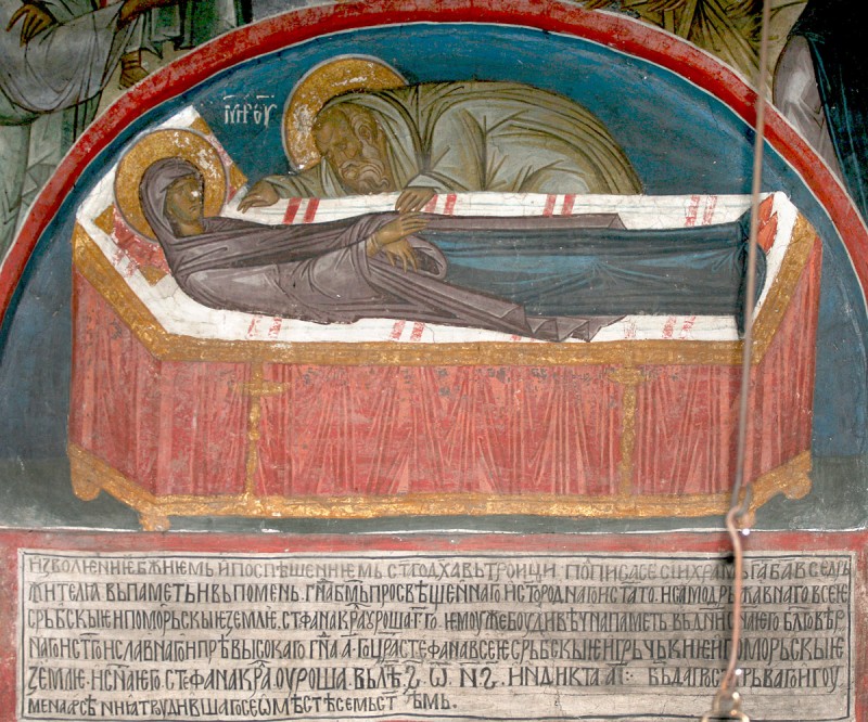 И, придя в Гефсиманский сад, положили пречистое тело Богородицы в гроб каменный, новый, высеченный заранее, и, приложив камень к двери гроба, три дня и три ночи слышали пение ангелов вокруг гроба Пресвятой Богородицы.