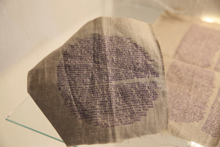 Подобыскное Евангелие. Фрагменты Евангелия от Марка, написанные на ткани с помощью пялец, для передачи в лагерь. Ткань, обернутую вокруг тела, при обыске обнаружить труднее, чем бумагу или книгу