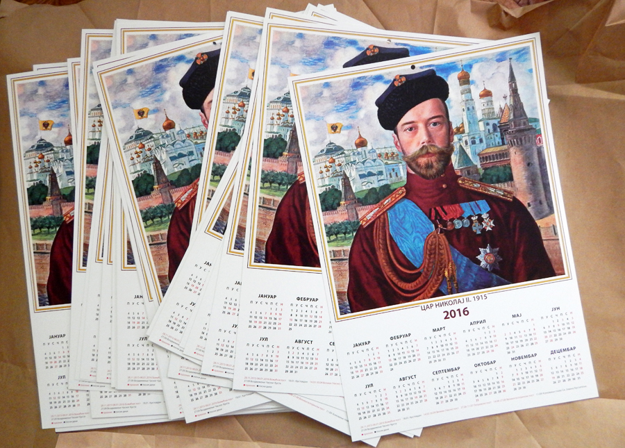 Иначе, зидни календар за 2016. годину са портретом цара Николаја II Романова појавио се у продаји почетком септембра, а портрет Цара Николаја који је на њему је 1915. године насликао познати руски уметник Борис Михајловић Кустодиев (1878-1927). Борис Кустодиев, представник руске интелигенције и поштовалац Свете Царске Породице, није могао остати равнодушан пред светом личношћу Цара. Ово уметничко дело је дубоко психолошко, грађено готово иконографски. Посебан акценат се ставља на боју царске униформе-пурпурну. Уметник је предосећао скоро мученичко страдање Царске Породице. Лик цара је смештен око зидина Кремља-симбола земаљске Русије која је неодвојива од свете, небеске, Русије и показује колику је љубав имао руски народ према своме Цару.