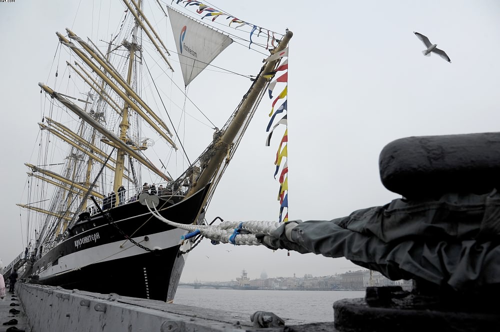 Барк "Крузенштерн" - учебное парусное судно. Построено в 1925-1926 годах на верфи Текленборга в Гестемюнде возле Бремерхафена (Германия), при спуске названо "Падуя", в 1946 году перешло по репарациям в собственность СССР и было переименовано в честь адмирала Ивана Крузенштерна. Порт приписки судна - Калининград. Судно совершало неоднократные трансатлантические и кругосветные экспедиции. В Санкт-Петербурге барк "Крузенштерн" завершил семимесячную историко-мемориальную экспедицию.