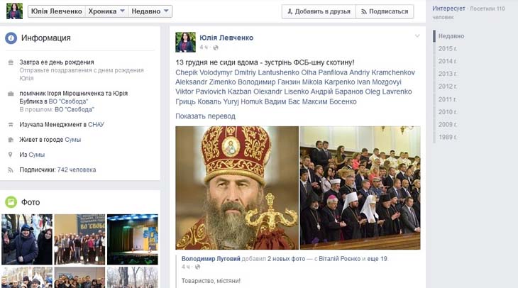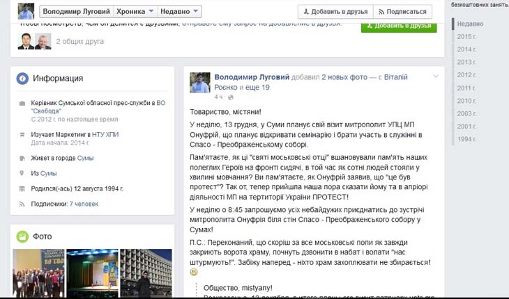 Готовится провокация против Предстоятеля Украинской Православной Церкви Блаженнейшего Митрополита Онуфрия, который 13 декабря посетит город Сумы. Информация об акции распространяется в социальной сети Facebook, сообщает "Православная жизнь" со ссылкой на Portal-pravoslavie.sumy.ua.