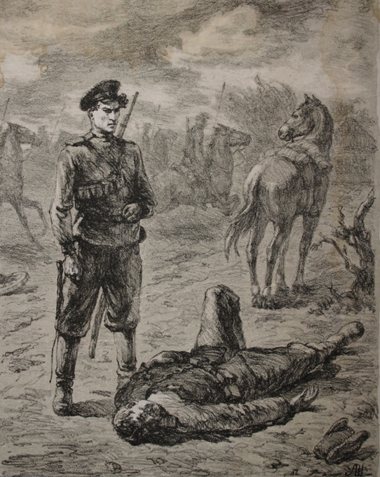 Лидия Шабаршина. Иллюстрации к роману «Тихий Дон». «Он бросил поводья и, сам не зная для чего, подошёл к зарубленному им австрийскому солдату… Гнусь и недоумение комкали душу.»