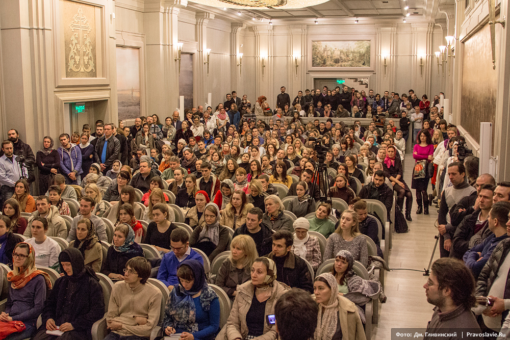 Но когда, например, в пятницу вечером зайдешь в любое кафе или в ресторан, то понимаешь, что в пятницу вечером молодежи в ресторане больше, чем в храме, это правда. А вот как сделать так, чтобы они нашли для себя в храме правильное времяпрепровождение, так сказать – духовный досуг – и чтобы они пришли лечиться и учиться?.. Здесь нужна ваша помощь. Сколько сегодня пришло на нашу встречу? Допустим, 400 человек. Круг общения каждого примерно два-три-четыре человека, а у многих и больше. Умножьте 400 на 4 – будет 1600. 1600 человек могут быть привлечены в Церковь или вовлечены в церковную жизнь при ваших усилиях, то есть вы тоже должны нести какую-то крупицу апостольского труда.