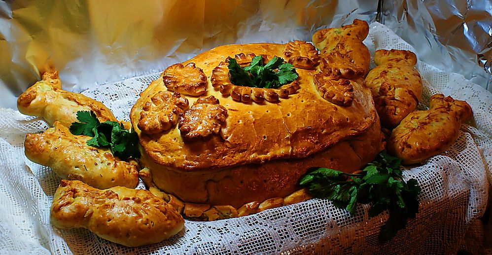 - Края теста соединить, шов хорошо заделать. Кулебяку смазать желтком, слегка разбавленным водой, при желании нанести любой узор из теста и дать постоять некоторое время. Выпекать в хорошо прогретой духовке.