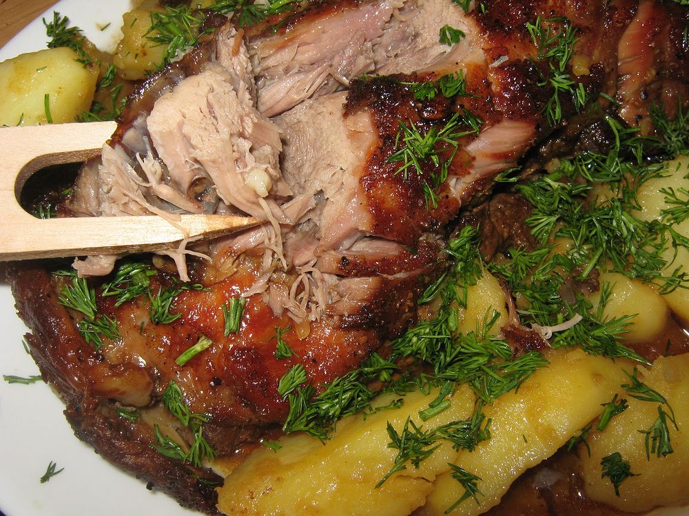 - Подаем блюдо. Свиной окорок в маринаде подается в горячем или охлажденном виде как главное мясное блюдо. К такой свинине подойдет нежирный гарнир (отваренный рис или овощи). Сок со дна формы можно использовать как соус.