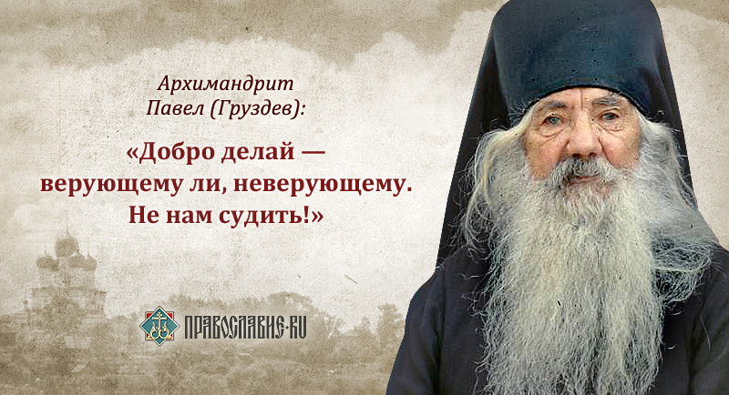 «Добро делай — верующему ли, неверующему. Не нам судить! Пьянице ли, разбойнику… Не пьянице делаешь ведь, человеку. Помни: первым разбойник вошел в Небесное Царство: “Помяни мя, Господи, во Царствии Твоем!” И Господь сказал: “Сегодня же будешь со Мной в раю!” И ты — делай, как разбойник благоразумный, и Господь тебя помилует».