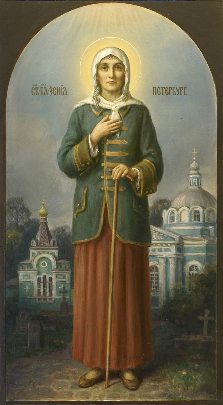 The only record of "vital statistics" which has been left us concerning Blessed Xenia is the epitaph on her gravestone: IN THE NAME OF THE FATHER, SON AND HOLY SPIRIT. HERE RESTS THE BODY OF THE SERVANT OF GOD, XENIA GRIGORIEVNA, WIFE OF THE IMPERIAL CHORISTER, COLONEL ANDREI THEODOROVICH PETROV. WIDOWED AT THE AGE OF 26, A PILGRIM FOR 45 YEARS, SHE LIVED A TOTAL OF 71 YEARS. SHE WAS KNOWN BY THE NAME ANDREI THEODOROVICH. MAY WHOEVER KNEW ME PRAY FOR MY SOUL THAT HIS OWN MAY BE SAVED. AMEN.