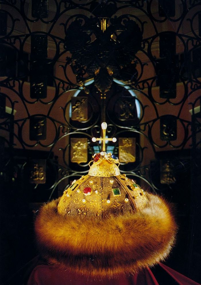 The Cap of Monomachus (Monomahk) was used to crown all the Russian Tsars up to Peter the Great. The cap is of oriental workmanship of the late 13th to 14th century…There are several legends about the Cap of Monomachus. The Medieval Tale of the Princes of Vladimir says that Emperor Constantine Monomachus of Byzantium presented his grandson, Prince Vladimir of Kiev, with the crown from his head. This crown is said to have been worn and handed by the princes first of Kiev, then of Vladimir and finally of Moscow. Thus, the Cap of Monomachus symbolizes the continuity of power of the Moscow Tsars from the emperors of Byzantium…in the will of Tsar Ivan the Terrible, it idea of Moscow as the “Third Rome” was popular. There was a rule that the Cap of Monomachus should be worn once in a lifetime, during the coronation. The grandmother of Ivan the Terrible was Sophia Palaiologina, the niece of the last Byzantine Emperor Constantine XI Palaiologos.[1] The Southern gate, which is the main entrance of the Dormition Cathedral, was used for the Tsar’s procession. On top is the image of the “Holy Virgin of Vladimir,” in Byzantine style.