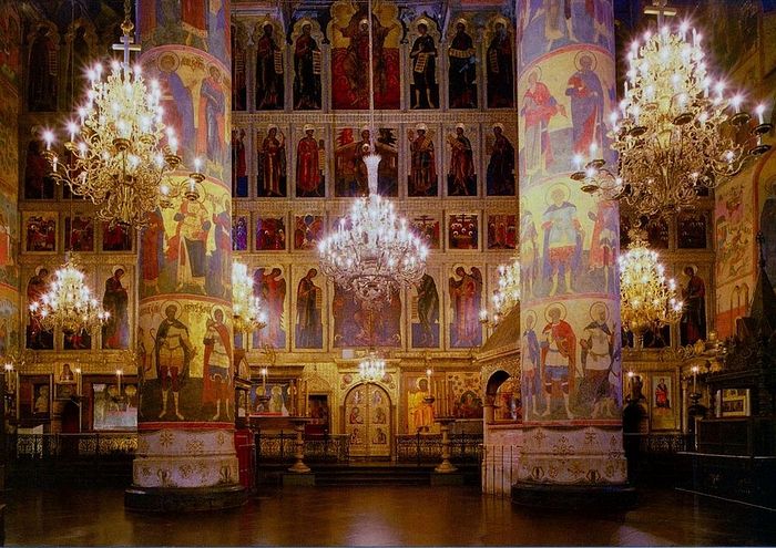 The present frescoes were created by Russian painters after the fire of 1547. The multi-tier iconostasis is one of the oldest surviving in Russia. It includes almost one hundred icons situated in six rows. Icons of the Festival and the Deesis (Greek for worship) tier were painted in the end of the 14th and beginning of 15th century, with the participation of Theophanes the Greek and Andrei Rublev. The Annunciation and Crucifixion icons are from the beginning of the 15th century.