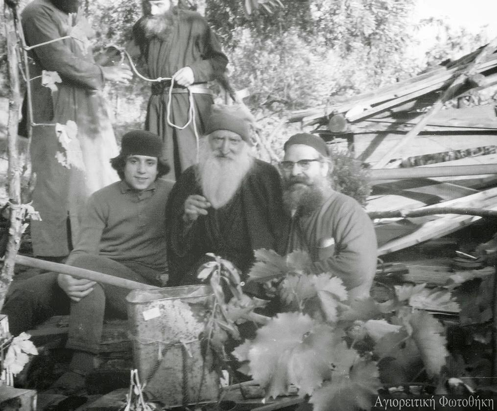 Старец Тихон (в центре) принимает монахов из братства Иосафеев. Прп. Паисий - на заднем плане, достает воду из бочки, чтобы предложить ее гостям). 1966