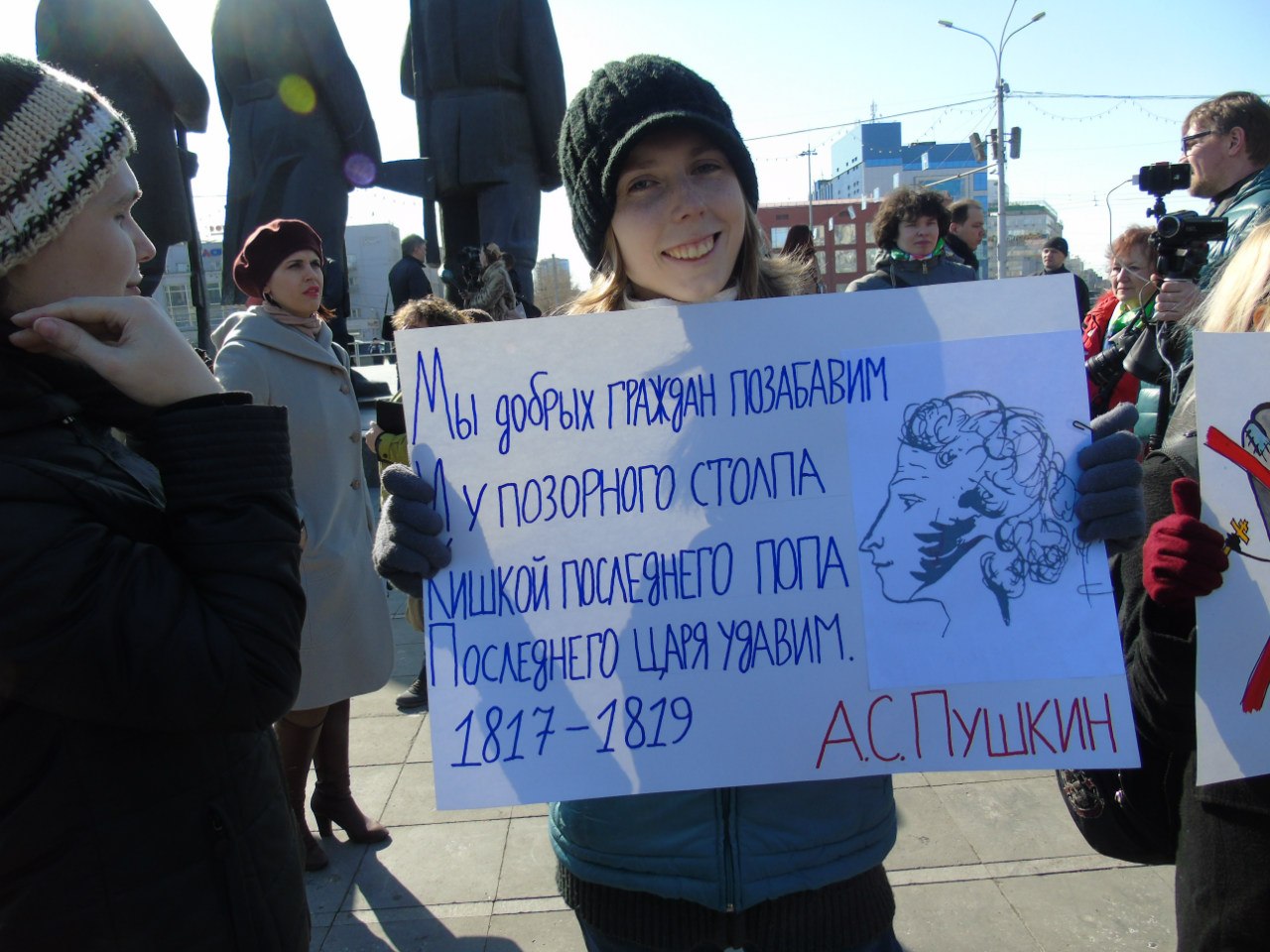 Но насчет девочки, которая держала табличку "Мы добрых граждан позабавим".. она не в курсе, что Пушкин в конце пути стал христианином. А данный стих - пророческий, когда случилось переворот в стране и кровавый террор.