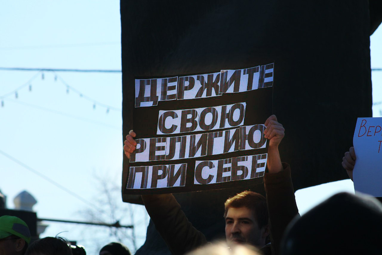 Итак, более тысячи человек в тот день вышли на главную площадь «столицы Сибири» с требованиями убрать из законодательства словосочетание «религиозные чувства верующих» (внести изменения в ст. 148 УК). Мишень, в общем-то, весьма удобная. На тот момент данное словосочетание стало уже своеобразным жупелом для некоторых субкультур: им можно пугать детей или, наоборот, повсеместно его высмеивать, и поэтому в той грустной истории с «Тангейзером» у защитников провокационной постановки все логично вернулось опять к этим самым «особым чувствам верующих». Это действительно удобно, поскольку против данного определения в законе выступают многие: от тех, кто считает эту формулировку нежизнеспособной, и до тех, кто считает ее противоречащей конституции РФ. И среди критиков Церкви сегодня не прошелся по этому выражению только ленивый. Между тем стоит рассмотреть всерьез, что же это за такие «религиозные чувства верующих», и против чего на самом деле выступала либеральная общественность на том митинге 2015 года.