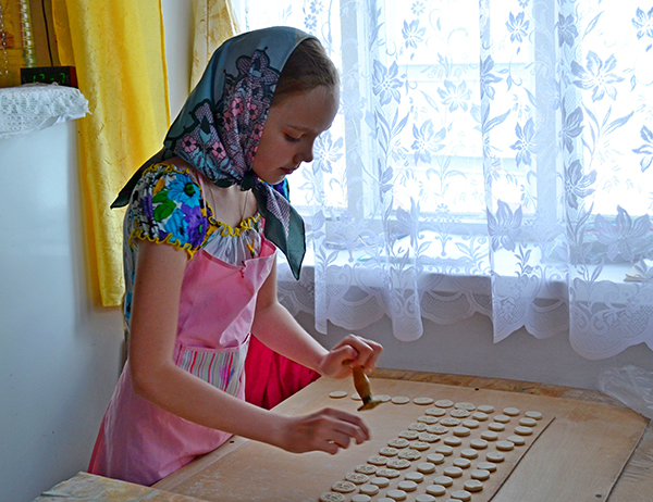В домике прохладный полумрак, который бывает в жару в помещениях с маленькими окнами. Сладко пахнет тестом. На противнях, заботливо укрытых белой тканью, подходят уже сделанные просфорки. А на большом столе Лера помогает старшей служительнице печатать рисунки на небольших круглых кусочках теста, напоминающих монеты. Затем эти кружки будут накладывать на просфоры, которые подходят рядом под тканью, и выпекать в печи. Получатся аккуратные «грибочки».