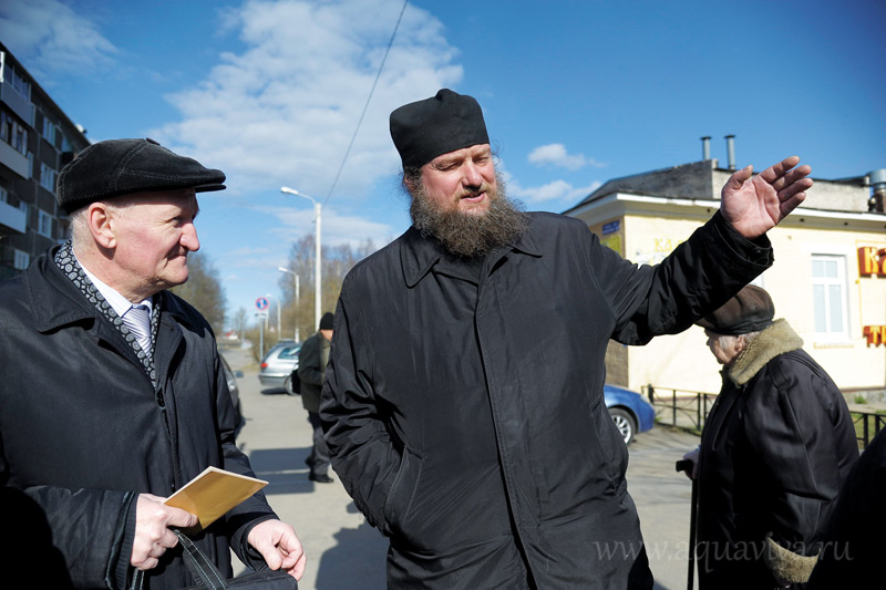 Каждый понедельник отец Сергий привозит к тосненской бане иеромонаха Николая (Паньшина) из Макариевой пустыни. Сначала он даже не особо заметен среди остальных участников благотворительной акции — тихий, низенький. Поговорить с ним не удалось — он всё время был занят беседой с пришедшими.