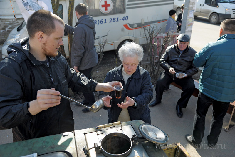— Сейчас я в ресторане уже и не работаю, — рассказывает молодой человек. — В основном, помогаю в храме по хозяйству. Заодно и готовлю еду для таких вот акций. Обычно это греча, рис или картошка. Из напитков — чай. Летом бывает компот.