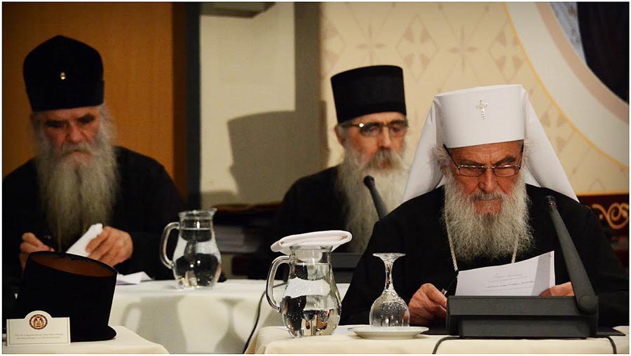 Патриарх Сербский Ириней, митрополит Черногорско-Приморский Амфилохий и епископ Бачский Ириней в президиуме.