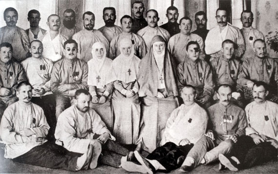 Группа раненых солдат Первой мировой войны в Марфо-Мариинской обители. В центре Елизавета Федоровна и сестра Варвара. Фото из музея Марфо-Мариинской Обители милосердия.