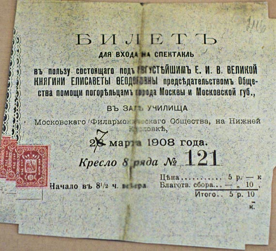 Билет на благотворительный спектакль в помощь погорельцам. Фото из музея Марфо-Мариинской Обители милосердия.