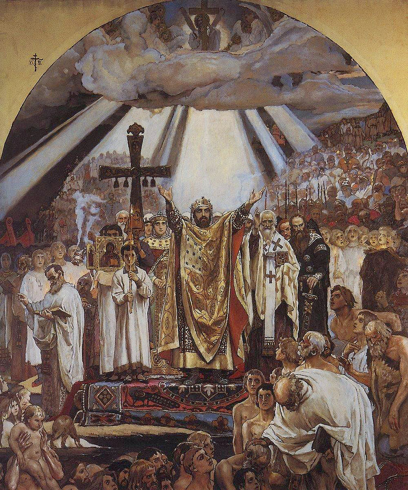 Когда Владимир стоял на холмах и смотрел на новокрещающихся людей, он не просто так стоял и смотрел. Он, как Соломон при освящении храма, воздевал свои руки – это отображено на не очень качественной, но очень тиражированной картине Васнецова из росписи Владимирского собора в Киеве. Он поднимал свои руки к Богу и молился за новопосвященных людей, чтобы Господь Сил, Господь Бог Небесный призрел на людей Своих новых и утвердил их в вере, чтобы они были настоящие христиане, чтобы он, князь, вел этих людей по жизни, просвещенных верой, обновленных благодатью.