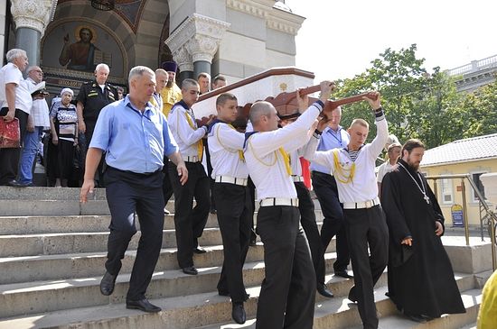 Во Владимирском соборе (усыпальнице) перед ракой с мощами святого воина был отслужен молебен, после чего мощи флотоводца пронесли Крестным ходом до штаба Черноморского Флота, где святой Феодор Ушаков в последний раз благословил флот и город, для которого он так много сделал, сообщает Севастопольское благочиние.