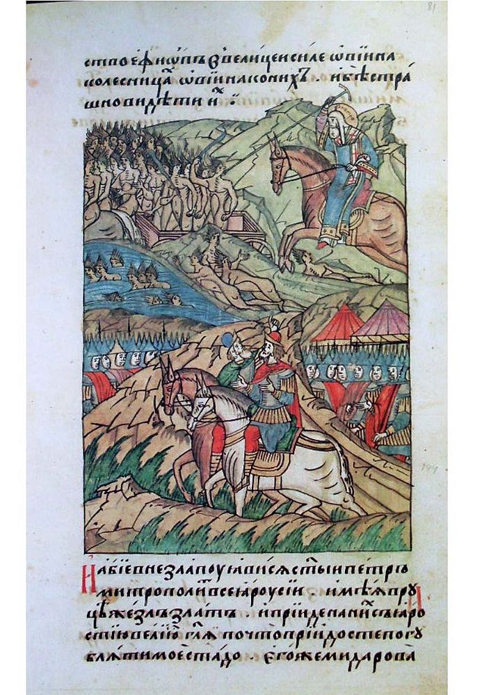 (Об одном из видений накануне битвы): А еще в ту ночь видели видение Василий Капица и Семен Антонов: видели они идущих из степи множество эфиопов с огромным войском – одни на колесницах, другие на конях, – и страшен был их вид. И вдруг внезапно появился святой Петр, митрополит всея Руси, держа в руке золотой жезл, и стал наступать на них с великой яростью, говоря: «Вы зачем пришли губить мое стадо, которое Бог мне даровал охранять!» И стал их жезлом своим колоть, и одни обратились в бегство, и некоторые из них убежали, а другие утонули в воде, а третьи полегли раненые. Все они рассказали свои видения великому князю Дмитрию Ивановичу. И он велел им об этом никому не рассказывать. И стал со слезами молиться Господу Богу, Пречистой Богородице и великому чудотворцу Петру, хранителю Русской земли, и святым мученикам Борису и Глебу, чтобы они избавили русских от татарской ярости, и чтобы псы не осквернили святыни, и чтобы не пожрал татарский меч православного христианства.