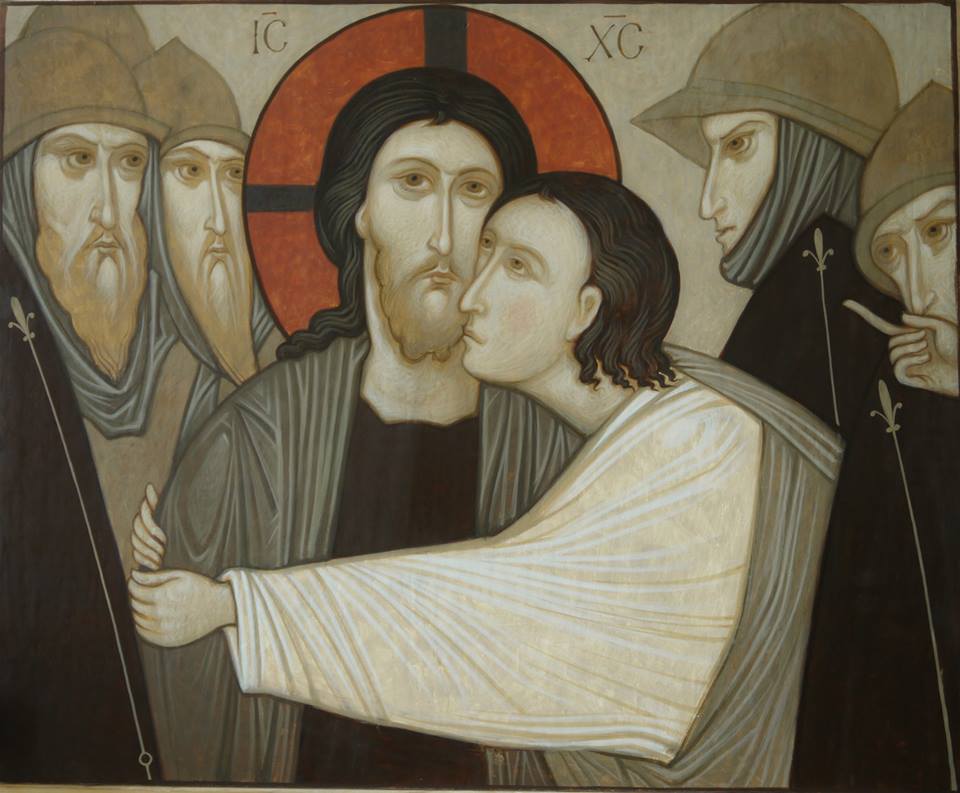 Thus in Maxim Sheshukov’s poetic work we encounter unquestionable dexterity, compositional flexibility, gracefulness of line and subtlety of color. There is also a kind of minimalism in his treatment of the backgrounds. However, the simplicity of the background pictorially works more as an energized field, rather than mere absence. It is as if the void manifests the divine Presence. Overall there is an all-embracing sense of joy in his delicate use of pastels, warm and cool grays. At times we encounter a child-like whimsicality. It is as if we are seeing through the profound purity of a child’s inner eye. Even if the scene depicted is Judas Accepting the 30 Pieces of Silver; hope, mercy and serenity are not too far distant. Not only are the usual prototypes readily discerned, but also he depicts moments rarely treated in isolation, such as the Slaying of Abel, Judas Accepting the 30 Pieces of Silver just mentioned, Zacchaeus Climbing the Sycamore Tree, Peter Weeping for His Denial and Christ Knocking at the Door.