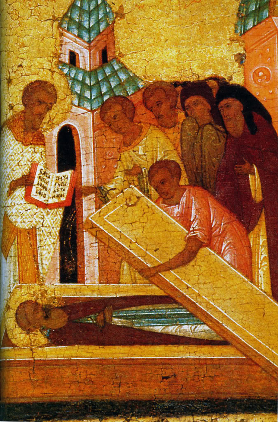 Прп. Сергий Радонежский, с Житием. Фрагмент. Клеймо " Отпевание Преподобного Сергия ". Первая треть XVI в. Мастерская Феодосия (сына Дионисия).