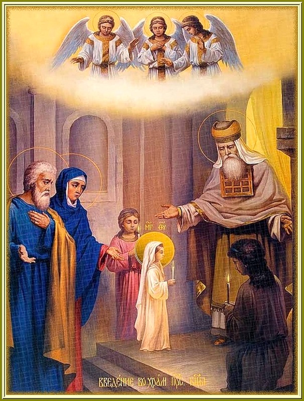 Этот праздник приходится на Рождественский пост, когда всё наполнено ожиданием рождения Богомладенца. И не случайно, конечно же, именно в это время мы вспоминаем о маленькой девочке Марии, Которая уже в младенчестве приуготовляется к тому, что должно будет случиться в Вифлееме. Дева Мария посвящается своими благочестивыми родителями на служение Богу от рождения, а Ее введение во храм, где Она будет жить до того времени, как войдет в дом праведного Иосифа Обручника и станет затем Матерью Господа, совершается в возрасте трех лет. Она Сама входит на ступени Храма — так символически полагается начало совсем иных отношений человека и Бога. Так, возможно, начинается и сам Новый Завет.