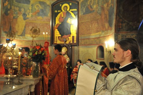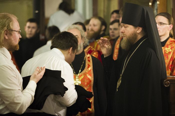 Накануне на Всенощном Бдении для студентов первого курса, произошло важное и знаковое событие в их жизни – они получили благословение ректора епископа Тихона на ношение подрясника.