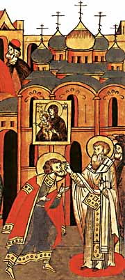 Такая вот простенькая "самонапрашивающаяся" мысль. Но она почему-то не пришла в православные головы за семь веков его почитания. Сам И. Н. Данилевский констатирует, что князь Александр Невский "в своем решении нашел понимание и поддержку, пусть не у всех современников, зато почти у всех потомков" (С.130-131). Почему так получилось, этого И. Н. Данилевский не объясняет, хотя хорошо известно, что большое видится на расстоянии. Не сообщает он и того, что после явления образа Александра Невского пономарю Владимирской церкви Рождества Пресвятой Богородицы в ночь на 8 сентября 1380 г., т.е. в канун Куликовской битвы, когда благоверный князь Александр Ярославич восстал в видении из гроба и выступил "на помощь правнуку своему, великому князю Дмитрию, одолеваему сущу от иноплеменников"(8), началось его народное почитание во Владимиро-Суздальской земле. В первой половине XVI в. известный церковный писатель Пахомий Серб составил канон Александру Невскому, а на Соборе 1547 г. Русская православная церковь причислила его, на основании разысканий о чудесах им творимых, уже к лику общерусских святых, как нового чудотворца. К этому событию по приказу митрополита Макария, для составляемых Великих Миней Четьих, было написано и первое каноническое житие святого князя Александра Невского на основе хорошо известного с конца XIII в. его княжеского жизнеописания. В 1552 г. совершилось чудо в присутствии Ивана Грозного, шедшего походом на Казанское царство и остановившегося во Владимире. Во время молебна у раки святого Александра Невского о даровании победы приближенный царя - Аркадий - получил исцеление рук и впоследствии написал еще одно житие святого. По всей Руси стали строиться храмы и закладываться монастыри в честь святого благоверного князя Александра. Один из них - Александро-Невская лавра - в устье Ижоры, на предполагаемом месте его победоносного сражения со шведами (9).