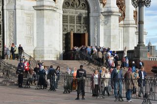 Поделюсь своими впечатлениями от более чем 4-х часового "стояния". На самом деле оно оказалось неожиданным по ряду факторов. Не было недовольных и раздраженных, как это обычно бывает в любых очередях. Практически никто не курил.Проплывающие мимо корабли с музыкой и гламуром за стеклянными колпаками были как из другой жизни, на них даже не смотрели.Но самое главное-мы пели! Организатором выступила женщина, не могу сказать о ее возрасте, но это было редкое сочетание религиозности и интеллигентности с внутренним обаянием.Она достала молитвенник и скоро вокруг нас образовалась группа людей,поддерживающих песнопения.Время шло незаметно, совершенно не было ощущения усталости.