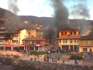 Толпа албанцев около Призренской семинарии во время погрома 17-19 марта 2004 г.